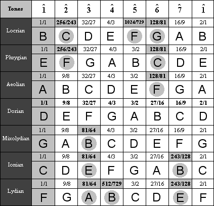 Having established the qualities of natural intervals by ratios and notation, we return to the expression of tones as letters. The table below shows the natural tones of each mode expressed as letters. Tones which differ from those of Dorian are shaded.