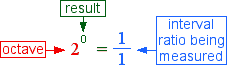 The top number line looks like a normal ruler; the tone 1/1 measured against the octave results in a distace of zero, as would be expected. A second numerical statement supplies a maximum value the other end of the ruler.