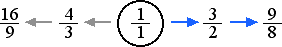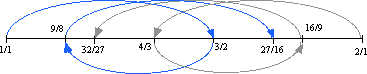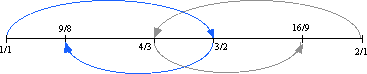 At this point, we may notice that the number line is getting fairly crowded. A small interval appears between 9/8 and 32/27, and also between 27/16 and 16/9.