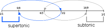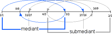 The names of these two new tones correspond to thier proximities to the tonic tones and the dominant tones. The tone 32/27 is roughly in the middle between the tonic and the dominant, while the tone 27/16 is roughly in the middle between the upper tonic and the subdominant. The word mediant means middle. 32/27 is the called the mediant while 27/16, being between then tonic and subdominant, is called the submediant. Again the names of this pair of tones reminds us that they are inversions of each other.