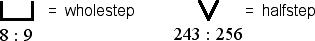 Notice that an interval, the distance between two tones, is found by dividing the higher tone by the lower tone, and the result is expressed with a colon in the form lower : higher. This form is used to distinguish intervals from tones, which are expressed with a slash in the form higher / lower. The interval 8:9 is significant, and a bracket-like figure is often used to represent this interval.