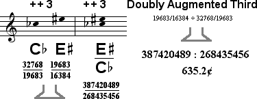 Comparing these intervals side by side again shows that the notation is misleading, as the interval spanning the smaller staff distance specifies a wider interval. The qualities of the intervals do however suggest the correct relationship between their sizes, as a doubly augmentated third is larger than a once diminished fifth.