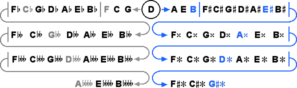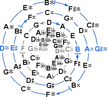 With ratios containing up to a whopping 13 digits, the 55 tone system includes new quadruple accidentals which correspond to adjacent scale steps notated a sixth apart in terms of raw staff distance, as shown below.