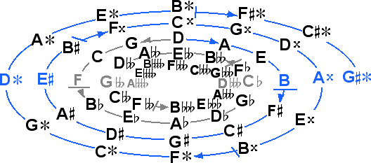 The interval sounds at nearly a perfect fifth, and this is of monumental significance. Consider that as the ends tones of the system this interval is systemically related to the augmented fourth F up to B from the diatonic naturals.