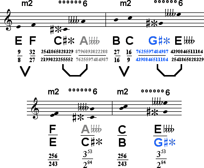 When we juxtapose these intervals, we find a very curious phenomenon. The minor seconds of the diatonic naturals literally converge into the near-unisons of the 55 tone system sextupally diminished sixths.