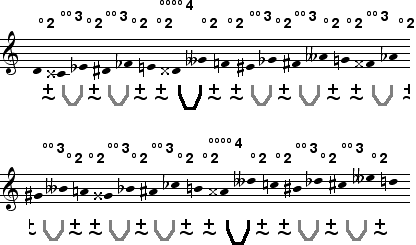 This is a system with rather flat fifths but fairly good thirds. The alternate method of handling the system works better in this case; by eliminating the two sextupally diminished fifths, the system of 41 Tone Equal Temperament, or 41ET, results.