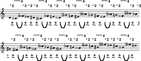 Next we consider the 43 tone system. Recall that this system has special significance because the end tones are altered versions of the source tone creating a sextupally diminished octave which sounds almost a perfect fourth. This system introduces triple accidentals, which have been discussed theoretically for centuries but have not been made standard so far.