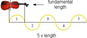 Our system was constructed symmetrically using the first new tone, 3. The idea of symmetry is also used with the second new tone, 5. Considering that the relationship between harmonics 5 and 1 is 5/1, which becomes 5/2 and then 5/4 when placed within the boundaries of 1 and 2, we can use this relationship in reverse to create symmetry around the source tone. The symmetrical tone is not produced by a segment 1/5 as long as the entire string, but rather by a string 5 times as long as the original fundamental. This longer length results in a very low pitch.