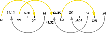 As things are getting a little crowded, we temporarily remove the tones derived so far, and we find the remaining tones which are shifted naturals, which fall very near those of the central chain. They are all shifted by a comma.